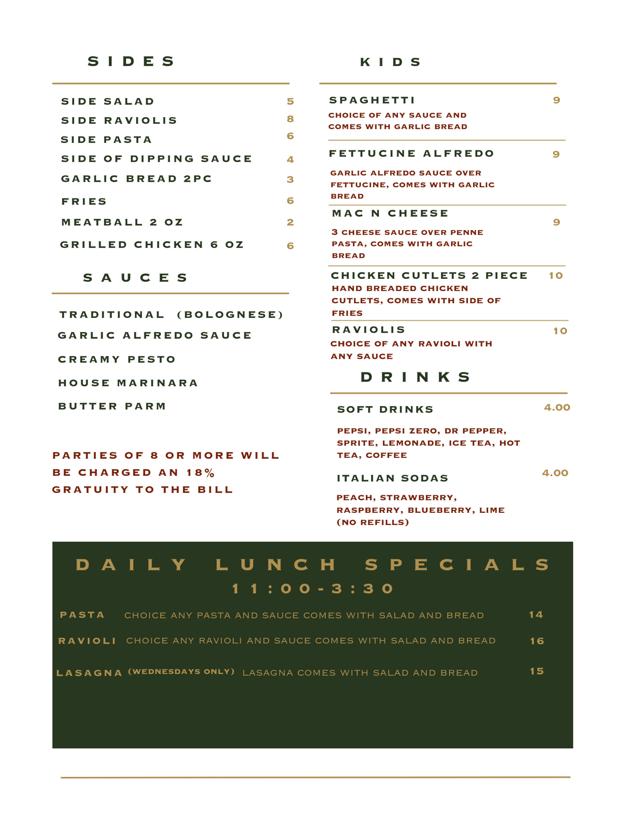 menu Raviolis all pastas & raviolis come with salad and garlic bread TRADITIONAL RAVIOLI Stuffed with beef, sausage, spinach, and cheese. Served with Bolognese sauce MUSHROOM RAVIOLI Stuffed with sautéed portabella mushrooms and cheese. Served with a garlic Alfredo sauce. CHEESE RAVIOLI Stuffed with mozzarella, parmesan, mascarpone cheeses. Served with our creamy pesto sauce. PASTA served with any choice of sauce: Traditional (Bolognese) / Garlic Alfredo / Creamy Pesto / House Marinara / Butter Parmesan SPAGHETTI FETTUCCINE PENNE Sandwiches all sandwiches come with choice of salad or pasta/ravioli STEAK SANDWICH Steak, pepper jack cheese, grilled onions, homemade steak spread on a baguette roll. CHICKEN PARMESAN SANDWICH Homemade breaded chicken cutlet, our award winning bolognese sauce with melted mozzarella on a ciabatta roll. CHICKEN PESTO SANDWICH Homemade breaded chicken cutlet, creamy pesto sauce with melted mozzarella, tomato, red onions on a ciabatta roll. SALADS HOUSE SALAD Spring Mix with red baby butter lettuce, red onion, crumbled feta, tossed with house Italian Dressing. SALAD ADD ONS Grilled chicken/Breaded Chicken SIDES House Salad Pasta/Ravioli Garlic Bread 2pc KIDS CHICKEN STRIP BASKET 2 pieces chicken strips and fries PASTA choose pasta or raviolis with garlic bread Raviolis To-Go BOLOGNESE SAUCE Quart or half-quart size container of our award winning sauce FROZEN RAVIOLIS Half or quarter tray filled with frozen traditional raviolis Catering Trays HALF TRAY RAVIOLIS feeds 10-12 people FULL TRAY RAVIOLIS feeds 20-25 people